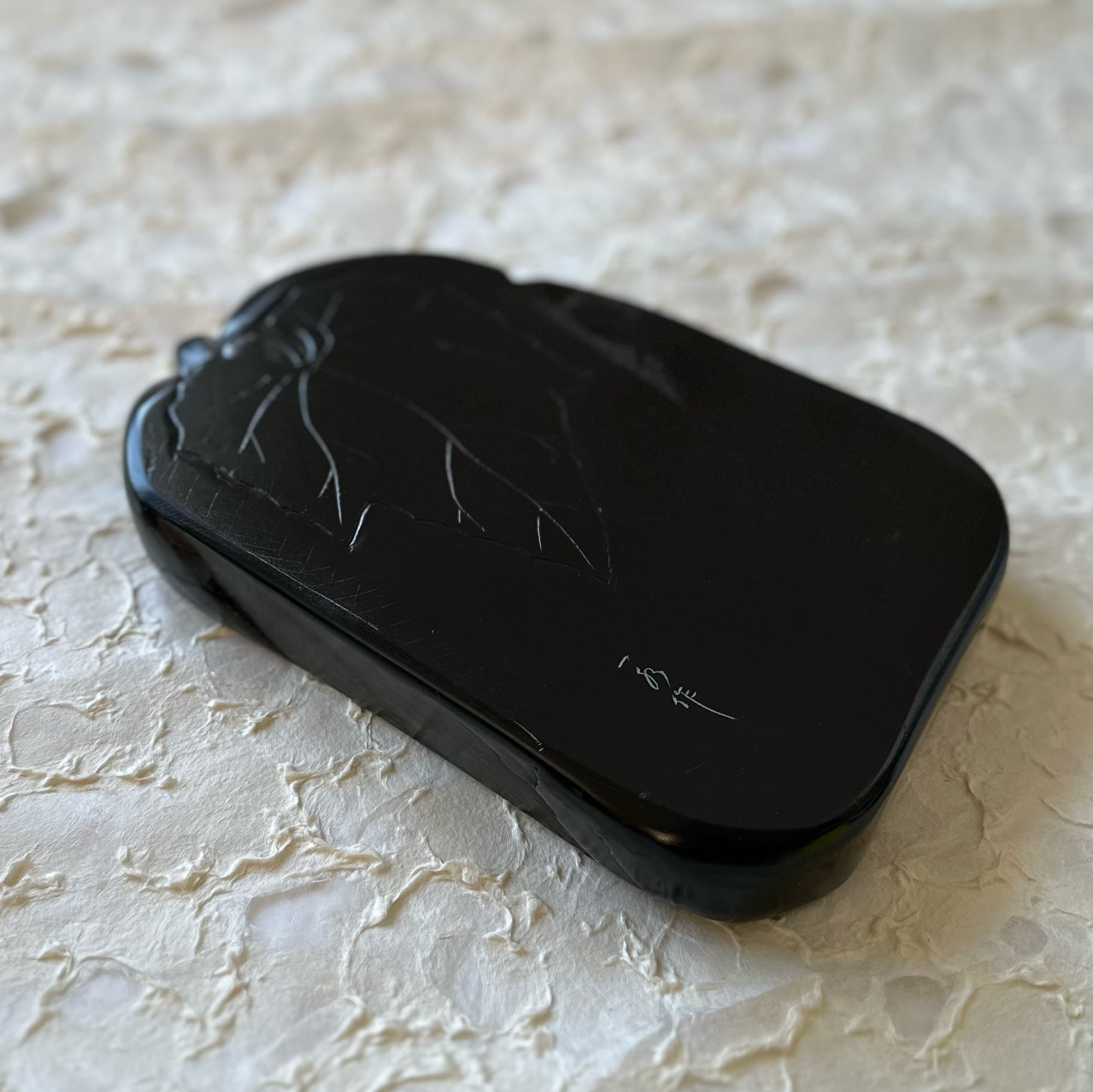 石質は細密温潤、鋒鋩も密立し、磨黒、発墨共に優れ、水落ちも良好です。